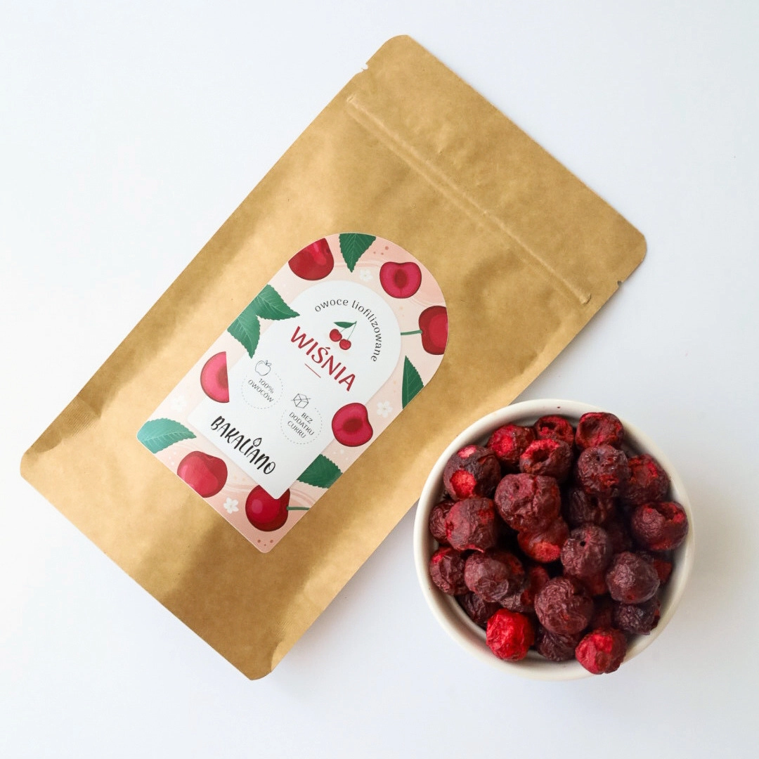 Wiśnie liofilizowane to naturalna, chrupiąca przekąska o wyrazistym, lekko kwaśnym smaku i intensywnym owocowym aromacie. Powstają w procesie liofilizacji, który polega na delikatnym usunięciu wody z owoców, dzięki czemu zachowują swoje naturalne właściwości.